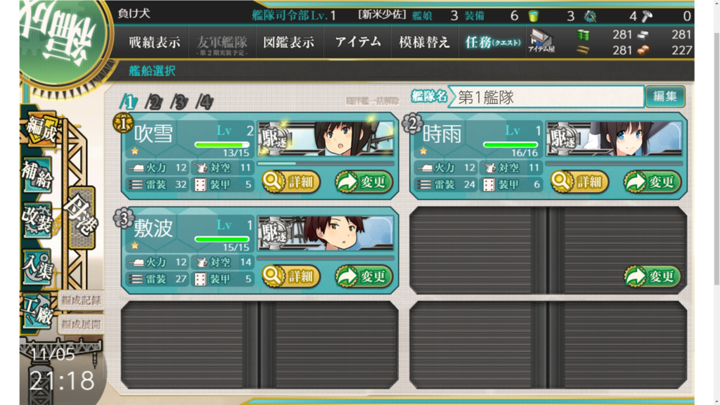 初期艦(最初に仲間になった娘)の吹雪ちゃんは最近になってレベルが最大になりました。